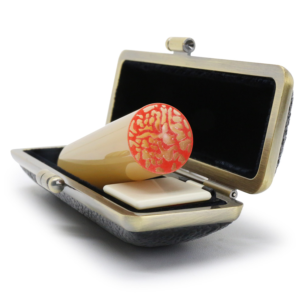 牛角(特上)の印鑑は、牛の角から切り出されるため、主成分はタンパク質でできています。朱肉の付き具合はとても良く、押印する際には紙にも良くなじみます。